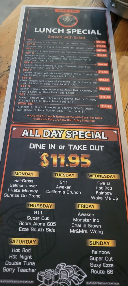 Introducing Ezze Sushi, a casual and trendy restaurant in Glendora, CA, offering a variety of delicious Japanese cuisine. With a menu that includes vegan and vegetarian options, as well as traditional favorites like teriyaki dishes and sushi rolls, Ezze Sushi caters to a diverse range of preferences. The appetizers, such as shrimp tempura and gyoza, are a perfect start to your meal. Customers rave about the generous portions and fresh ingredients, particularly highlighting the spicy tuna hand roll and the blue crab roll. The attentive service, extensive happy hour menu, and relaxed ambiance make Ezze Sushi a must-visit for sushi enthusiasts. Don't miss out on trying their specialty rolls, such as the Salmon Lover and Mustang Roll, for a unique and flavorful dining experience.